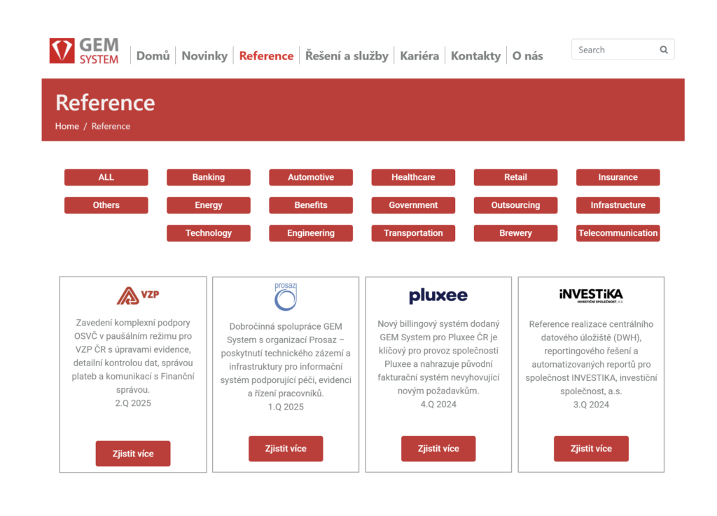 🚀 Nové IT projekty, nové výzvy, nová inspirace: naše reference mluví za nás / Každý úspěšný projekt začíná důvěrou – a my si vážíme těch, kteří nám ji dávají. V GEM System dlouhodobě dodáváme špičková IT řešení pro klíčové hráče v bankovnictví, automotive, energetice i veřejné správě. Naše nové reference ukazují, jak kombinace odbornosti, technologické inovace a spolehlivého delivery přináší skutečnou hodnotu partnerům v B2B i B2G segmentu. Podívejte se na naše aktuální projekty a zjistěte, proč se na nás spoléhají lídři trhu – všechny reference GEM System